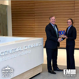 Jim Garrettson, founder and CEO of Executive Mosaic, presented Amy Gilliland, president of General Dynamics Information Technology, with her second consecutive 2019 Wash100 Award on Tuesday.