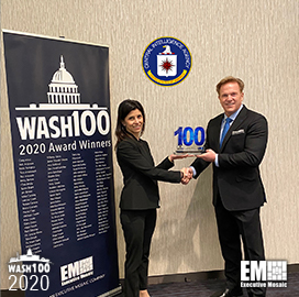 Jim Garrettson, founder and CEO of Executive Mosaic, presented Juliane Gallina, chief information officer of the CIA, her first Wash100 Award during Potomac Officers Club’s CIO Forum 2020 on Thursday.