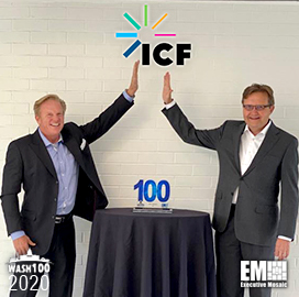 John Wasson, CEO of ICF, was presented his 2020 Wash100 Award on Thursday by Jim Garrettson, founder and CEO of Executive Mosaic. This marks the first Wash100 Award win for Wasson after securing valuable contracts and acquisitions to drive ICF’s revenue and expansion.