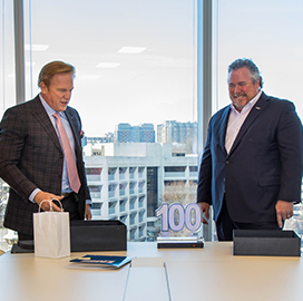 Doug Wagoner, president and CEO of LMI, received a visit from Executive Mosaic CEO Jim Garrettson on Thursday. During their meeting, Wagoner was presented his 2021 Wash100 Award, the most significant award in all of government contracting (GovCon), to recognize his leadership and growth strategy to drive LMI’s revenue during the COVID-19 pandemic.