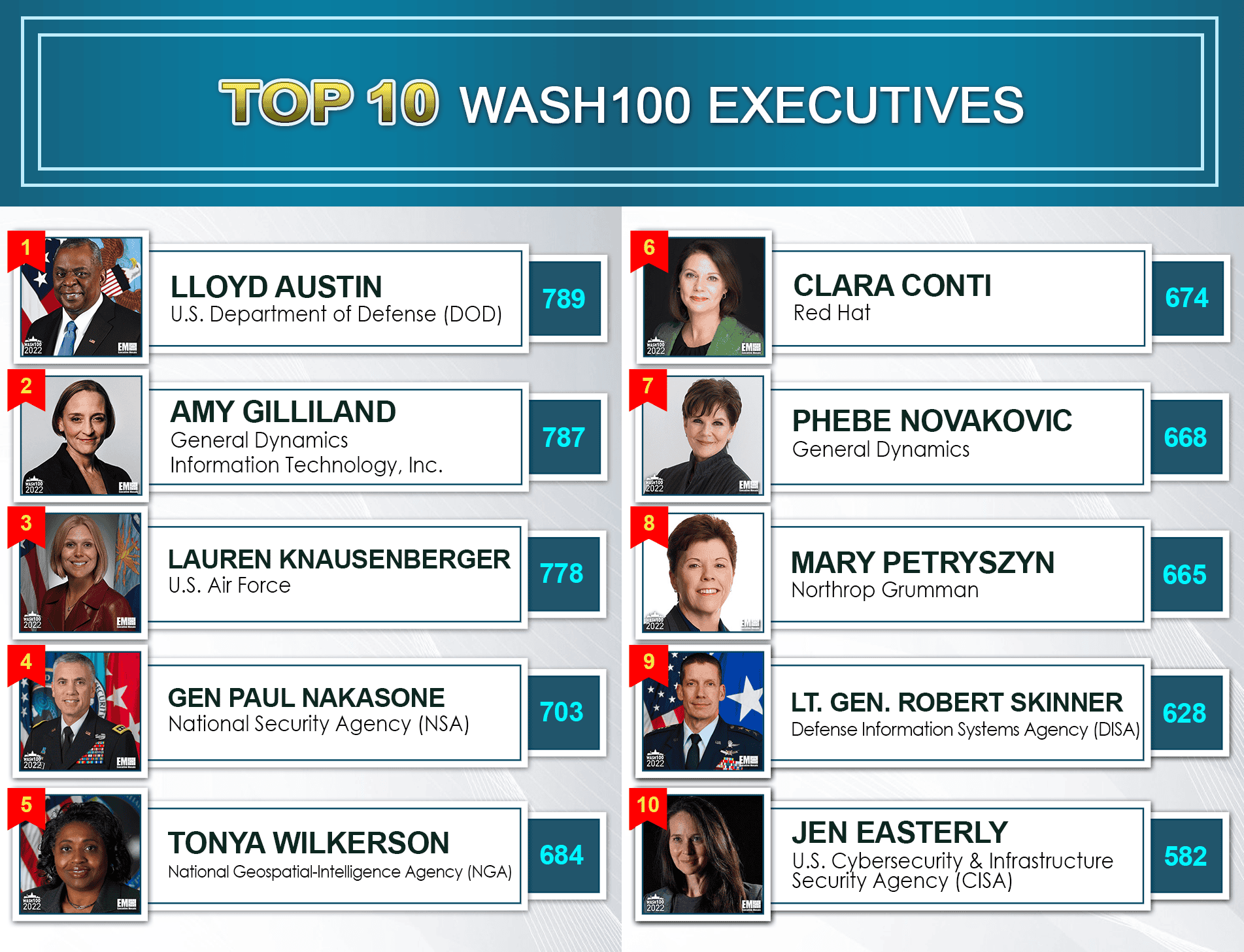 Defense Secretary Lloyd Austin is sitting in first place by only a handful of votes. At the moment, General Dynamics Information Technology President Amy Gilliland has surged into second place, as Lauren Knausenberger, CIO at the Department of the Air Force, is holding onto third place. Every single vote matters and it’s looking like an intense photo finish on April 30th.