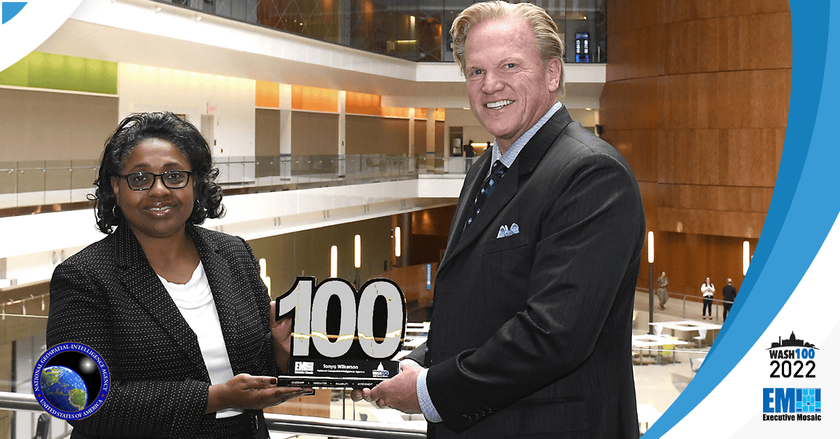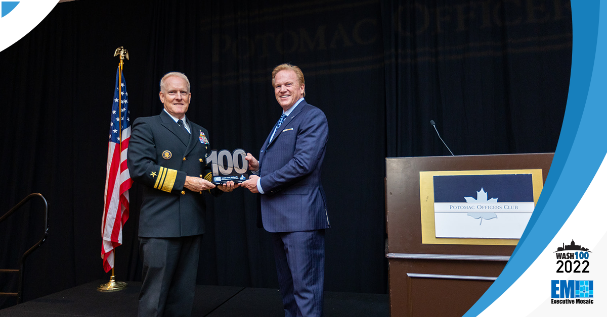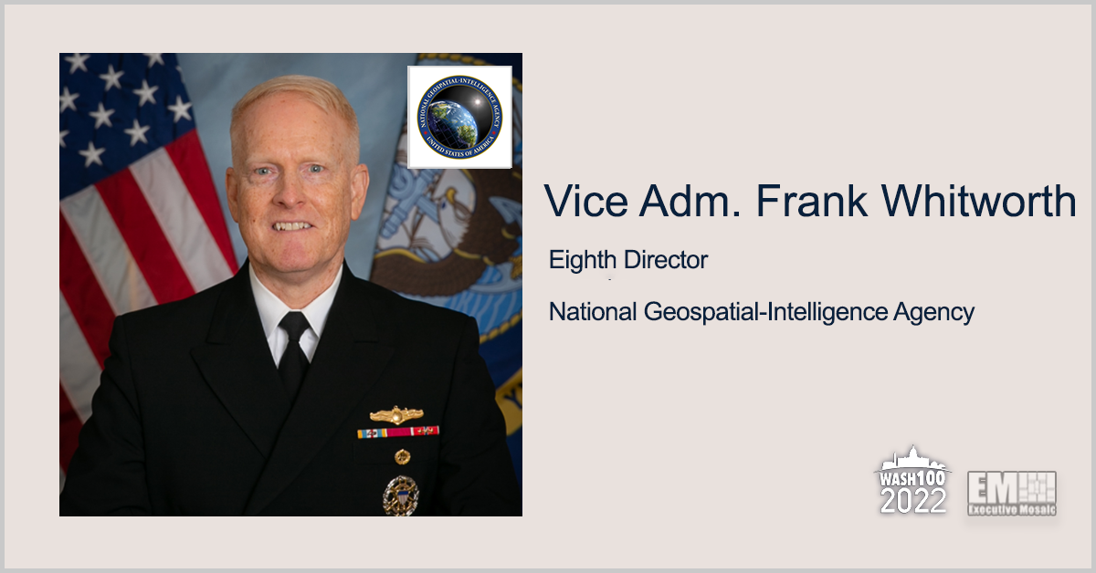 Vice Adm. Frank Whitworth, recently confirmed director of the National Geospatial-Intelligence Agency (NGA), was presented his 2022 Wash100 Award, the highest honor in the government contracting (GovCon) community, by Executive Mosaic CEO Jim Garrettson.