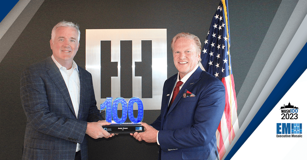 Andy Green, executive vice president of HII and president of the company’s mission technologies division, recently accepted his 2023 Wash100 Award during a meeting with Executive Mosaic CEO Jim Garrettson.