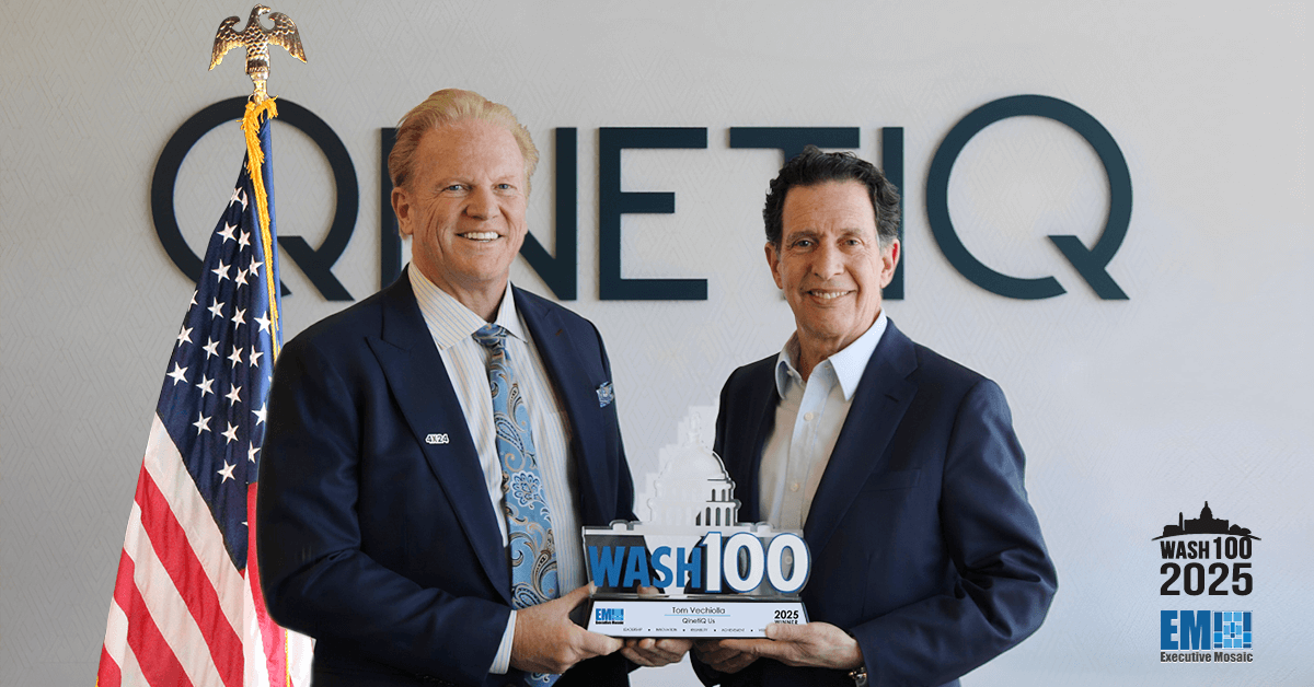 Commenting on Vecchiolla’s win, Garrettson, who founded the Wash100 Awards, said, “Tom, the new president and CEO of QinetiQ US, is bringing decades of impressive experience to his new role. A U.S. Navy veteran, Tom has built a distinguished career in defense, national security, and industry.”