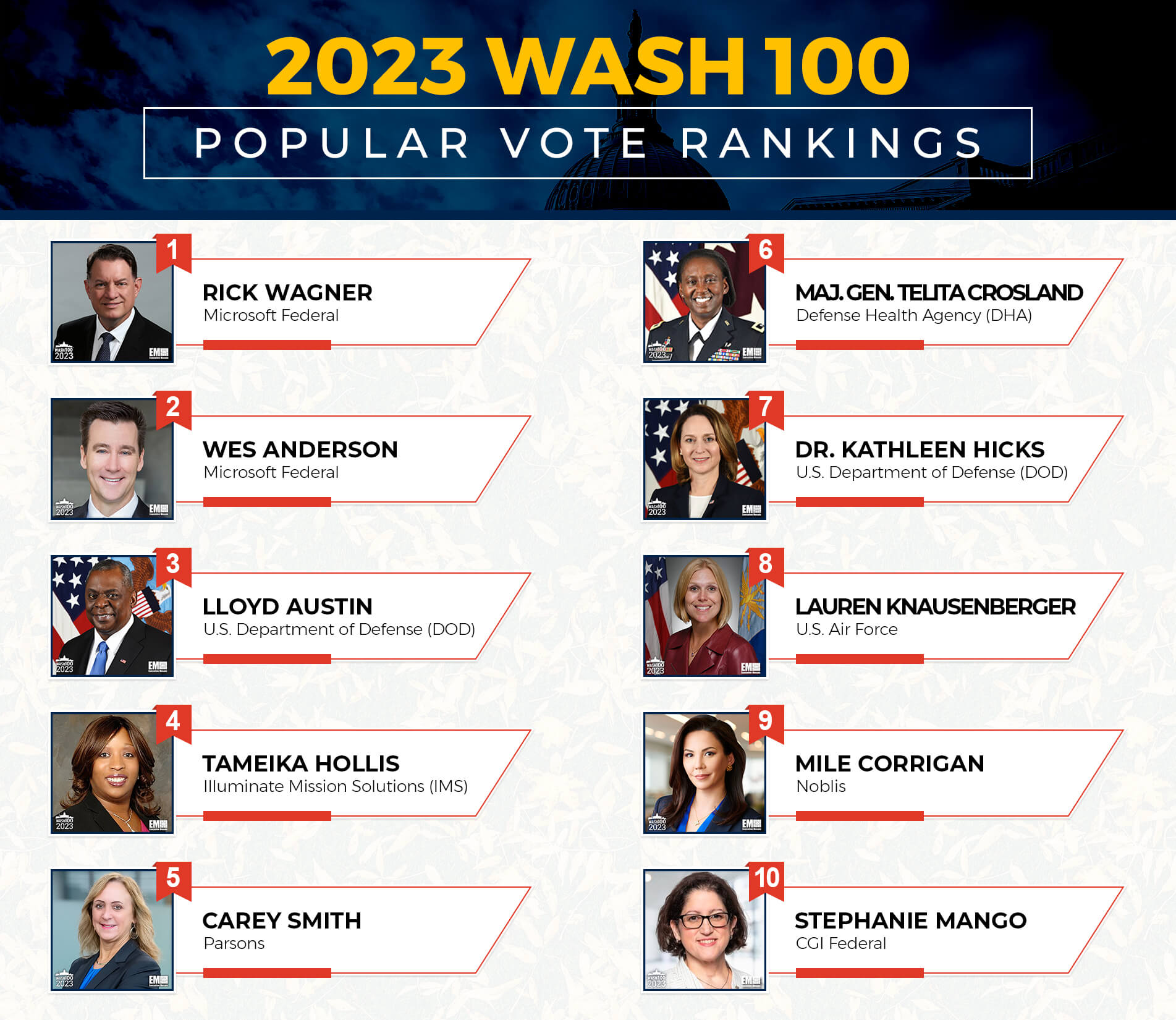 As of this writing, six-time recipient, Microsoft Federal President Rick Wagner stands tall in the number one spot with an early lead. His colleague, Microsoft Federal Vice President of Defense Wes Anderson follows him at number two, while Secretary of Defense Lloyd Austin is the highest ranking government awardee at number three. Rounding out the top five are first-time Wash100 winner and Illuminate Mission Solutions CEO Tameika Hollis in fourth place and Parsons CEO Carey Smith, celebrating her fifth award, in fifth place.