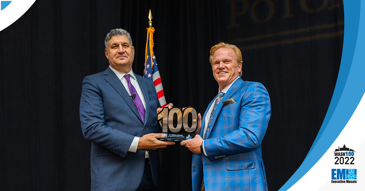 William LaPlante, undersecretary for acquisition and sustainment at the Department of Defense, was  presented his 2022 Wash100 Award, the most prestigious award in all of government contracting (GovCon), by Executive Mosaic CEO Jim Garrettson during a summit hosted by Potomac Officers Club (POC).