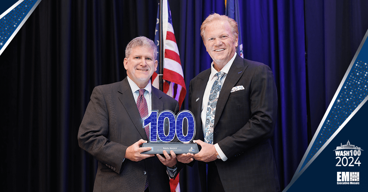 Randy Resnick, director of the Zero Trust Portfolio Management Office within the Department of Defense’s Office of the Chief Information Officer, accepted his 2024 Wash100 Award during the Potomac Officers Club’s 2024 Cyber Summit. Executive Mosaic CEO and Wash100 Founder Jim Garrettson presented the recognition.