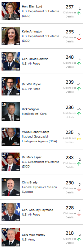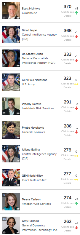 Gina Haspel, director of the Central Intelligence Agency (CIA), remains in second place and trails McIntyre by only one vote. Stacey Dixon, National Geospatial-Intelligence Agency’s (NGA) deputy director, is holding her spot in third place. While the top three executives have held their positions, these leaders rely on your vote to secure their standing.