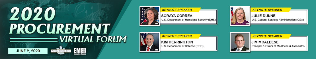 On Tuesday, June 9th, the Procurement Virtual Forum will feature Soraya Correa, chief procurement officer of the Department of Homeland Security (DHS); Julie Dunne, commissioner of Federal Acquisition Service (FAS) with the General Services Administration (GSA) and Kim Herrington, acting principal director of Defense Pricing and Contracting of Department of Defense (DoD) and GovCon Expert and DoD Maven Jim McAleese of McAleese and Associates as keynote speakers.