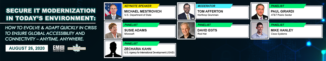 On Wednesday, Potomac Officers Club (POC) hosted its latest virtual event, Secure IT Modernization in Today’s Environment, featuring a keynote address from Michael Mestrovich, principal deputy chief information officer (CIO) for the U.S. Department of State, and a full expert panel to discuss how federal agencies can adapt and evolve quickly in a crisis such as the COVID-19 pandemic and ensure global accessibility and connectivity of our information technology capabilities are available.