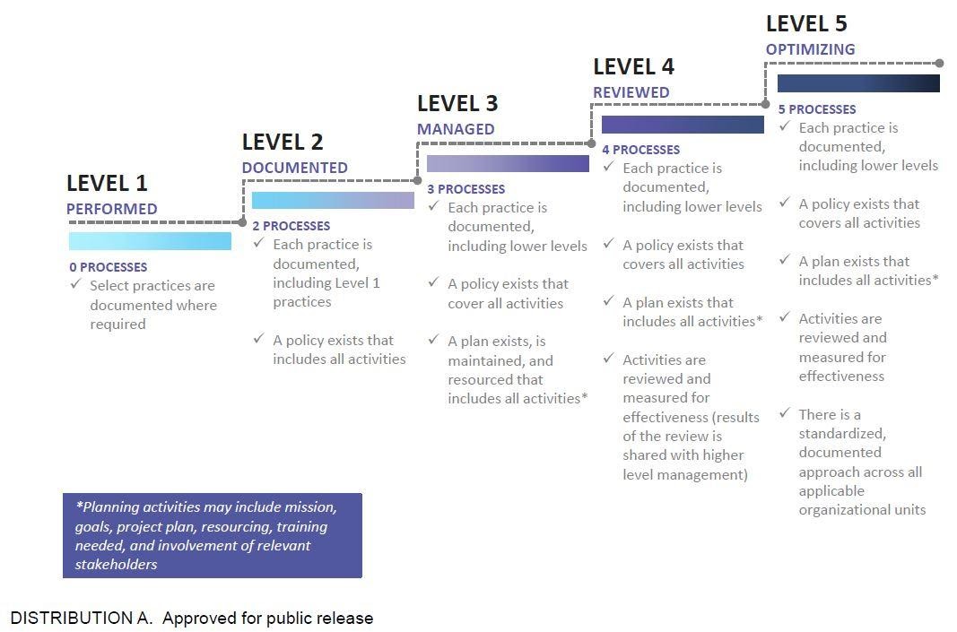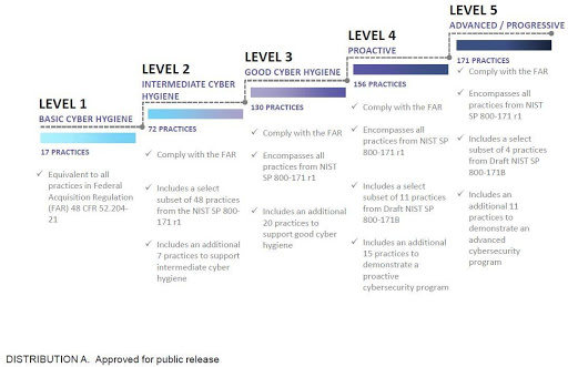 The CMMC model is designed to protect sensitive information along the DoD supply chain. It prescribes best practices to which contractors must document adherence in order to get CMMC-certified to one of the framework’s five levels of cybersecurity. Those levels include Basic, Intermediate, Good, Proactive, and Advanced/Progressive.