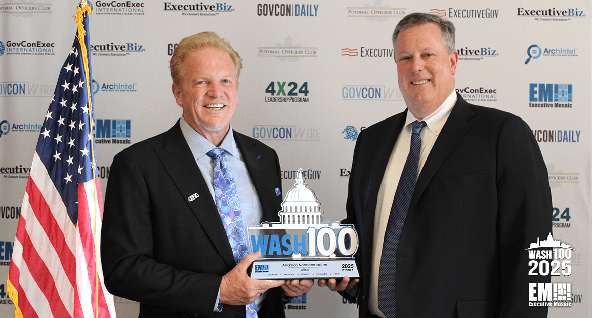 Bill Monet, president and CEO of Akima, has accepted the 2025 Wash100 Award from Executive Mosaic CEO Jim Garrettson. The Akima executive was