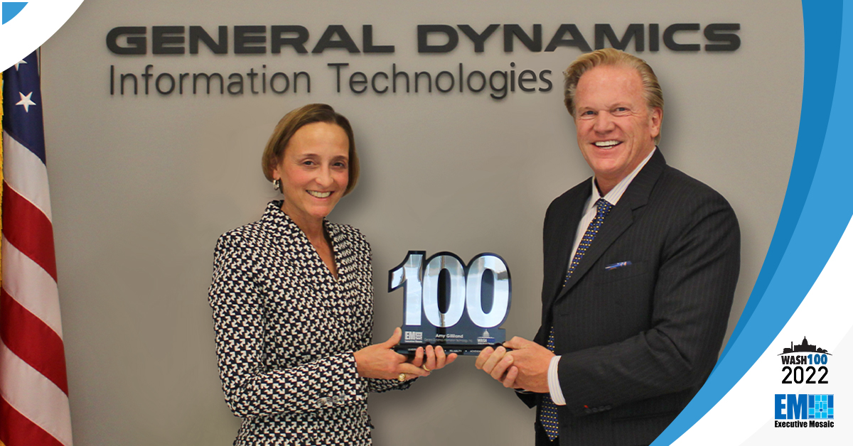 Lauren Knausenberger, chief information officer for the Department of the Air Force, was recently presented her 2022 Wash100 Award by Executive Mosaic CEO Jim Garrettson during a visit to the Air Force’s office within the Pentagon in Washington D.C. “A two-time winner of the Wash100, Lauren’s popularity is no surprise to those who have eithe...