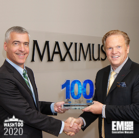 Jim Garrettson, founder and CEO of Executive Mosaic, presented Bruce Caswell, president and CEO of Maximus, with his first 2019 Wash100 Award on Thursday. The Wash100 award, in its sixth annual year, recognizes the most influential and impactful executives in the GovCon industry, as selected by the Executive Mosaic organization in combination w...