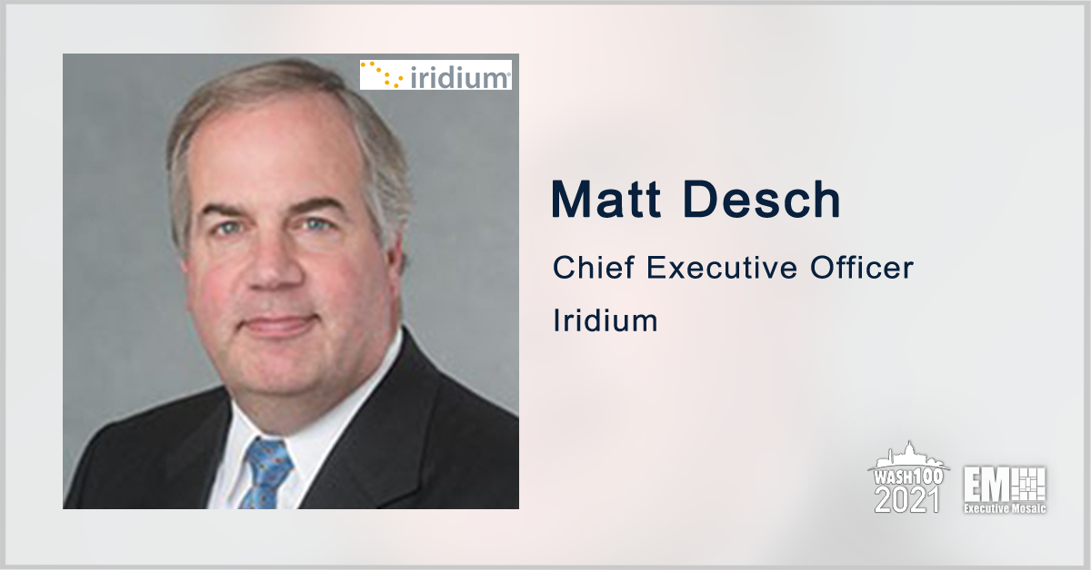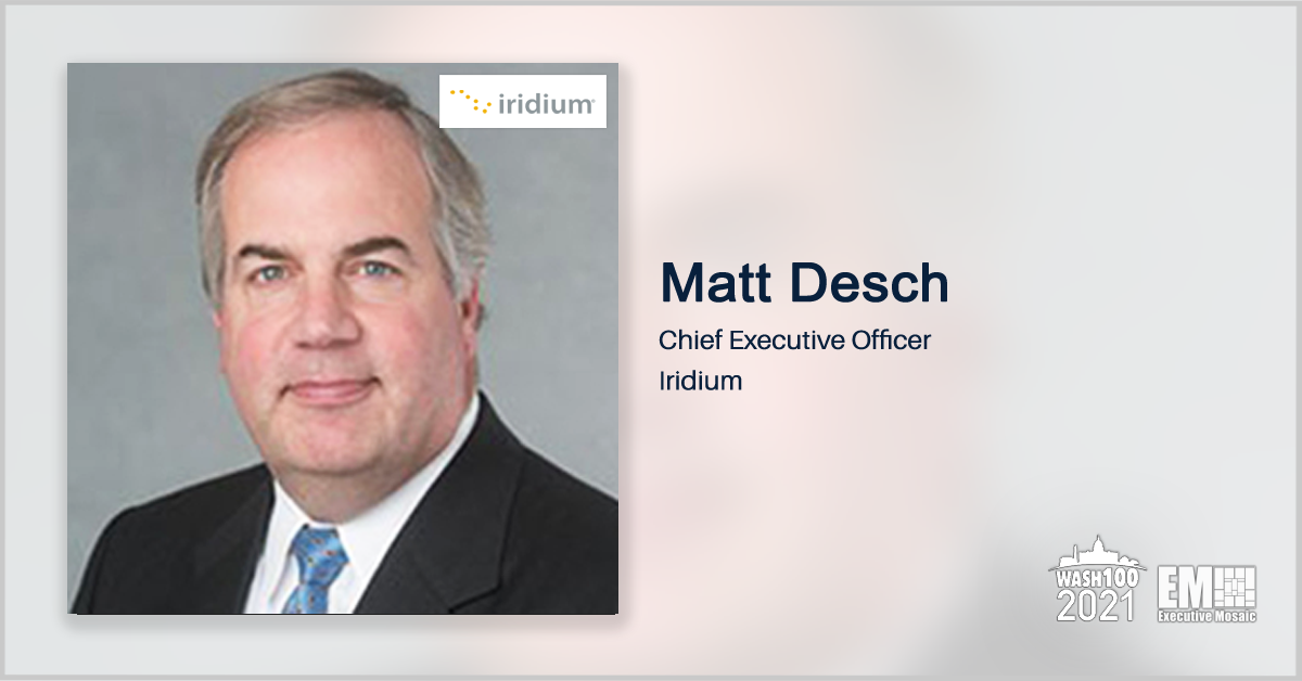 Executive Mosaic is pleased to induct Matt Desch, CEO of Iridium Communications, into the 2022 class of its esteemed Wash100 Award, which is annually bestowed upon the top 100 executives in the government contracting community for their noteworthy achievements, innovative vision and measurable influence across the federal sector. This marks Deschâ...