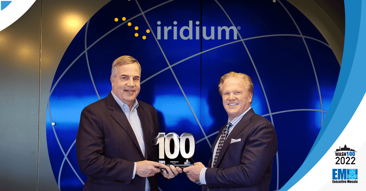 Matt Desch, who has led Iridium Communications as its CEO since 2006, received a recent visit from Executive Mosaic CEO Jim Garrettson to the company’s office in McLean, VA. Garrettson officially presented Matt Desch with his 2022 Wash100 Award, the most prestigious and coveted award in all of government contracting (GovCon). “Matt’s busine...