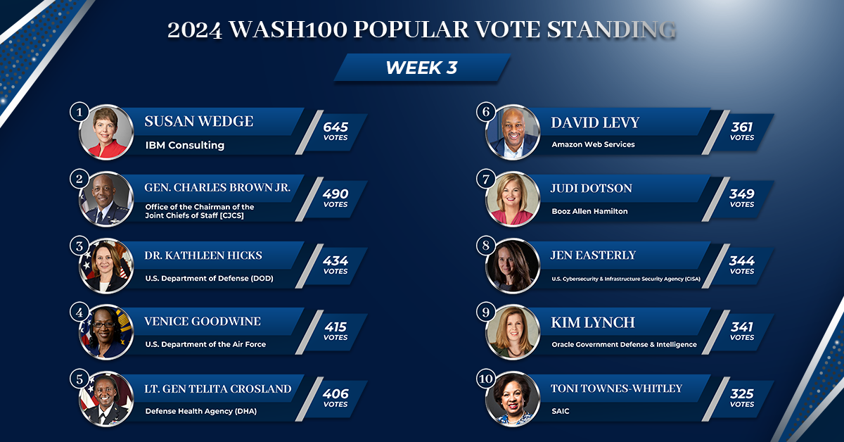 We’re back to give you a front row seat to the new developments in the Wash100 Award’s yearly popular vote contest. Strap in — as always, this week was full of surprising upsets, thrilling shake-ups and new entrants to the race. If you’re not familiar with the Wash100 Award, it is the highest honor in government...