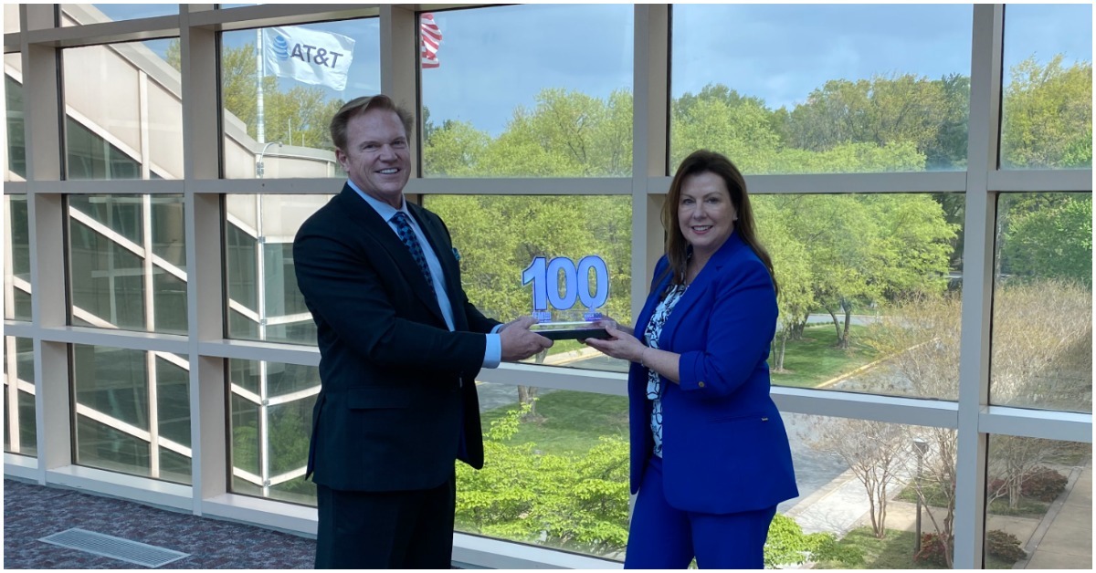 Jim Garrettson, CEO of Executive Mosaic and founder of the Wash100 Award, presented the sixth Wash100 Award to Jill Singer, vice president of Defense and National Security for AT&T’s public sector business and First Responder Network Authority (FirstNet) program, during a visit to AT&T headquarters on Thursday. As a 2021 Wash100 Award reci...