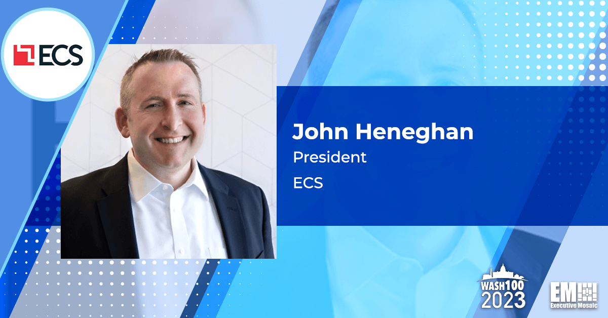 ECS President John Heneghan was recently presented with his third Wash100 Award during a meeting with Jim Garrettson, CEO of Executive Mosaic and creator of the esteemed Wash100 Award. Wash100 is an annual commemoration of government contracting industry executives who have established themselves as forces to be reckoned with in the field. A Wash...